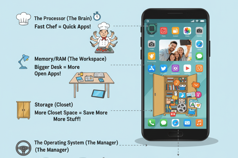 Storage (The Closet): THIS is where all your precious photos, videos, apps, and documents live. It's measured in "gigabytes" (GB). The more GBs you have, the more stuff you can save on your phone. If you love taking pictures or downloading lots of apps, you'll want more storage.